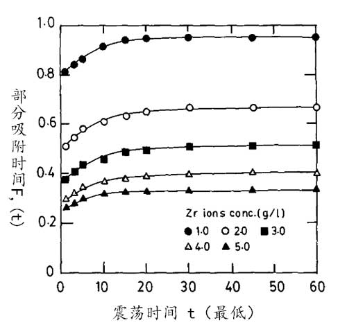 圖2.不同鋯離子濃度下活性炭對搖動時間的鋯離子吸附。