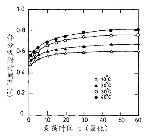圖1.活性炭上的鋯離子在不同溫度下的振蕩時間(溶液濃度2 g / l,pH 1.9)。