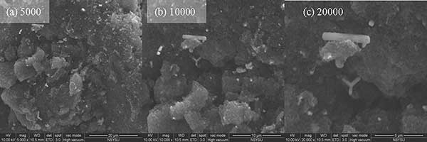 硫浸漬活性炭由大量微孔組成,高硫含量增強了活性炭對氯化汞的吸附能力。微孔通常具有大部分HgCl2吸附的活性位點,而大孔和中孔作為運輸路線。圖21顯示了分別放大5000,10,000和20,000倍的硫浸漬活性炭的ESEM圖像。如圖1所示,主要在活性炭表面發現大于500的大孔,中孔和微孔隱藏在活性炭內部。在硫浸漬之后,硫分子可以擴散并沉積在活性炭的微孔上,并且可能堵塞過渡路徑。